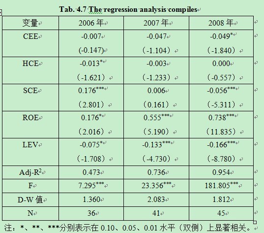 我做的是智力资本对企业绩效的影响,用的VAIC法,获利能力设为因变量,建立直线方程:P=α+β1 CEE+β2 HCE +β3 SCE+β4 ROE+β5 LEV +ξ,其中CEE物质资本增值系数HCE人力资本增值系数SCE结构资本增值系数ROE净资产收益率LEV资产负债率。之前看到的参考文章都是直接设立类似的直线模型,或者干脆直接回归分析不体现模型。回归结果如下: