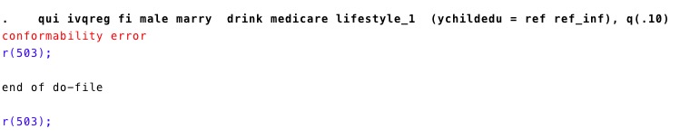 在用stata做工具变量分位数(ivqreg)回归时,全样本分析没问题,但换到子样本时,stata就会提示出现conformability error问题。如下图: