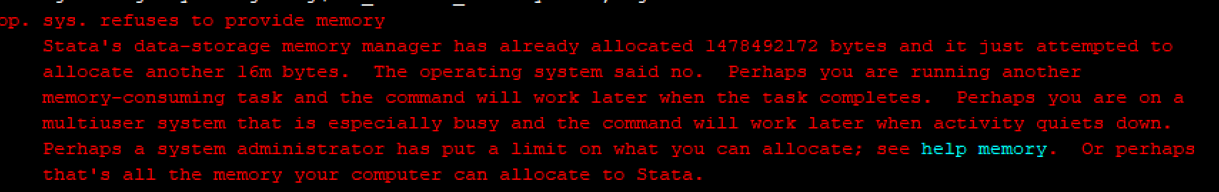Stata's data-storage memory manager has already allocated 1478492172 bytes and it just attempted to