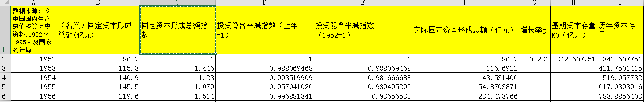 总值核算历史资料:1952~ 1995》及国家统计局 | (名义)固定资本形成总额(亿元) | 固定资本形成总额指数 | 投资隐含平减指数(上年=1) | 投资隐含平减指数(1952=1) | 实际固定资本形成总额(亿元) | 增长率g | 基期资本存量K0(亿元) | 历年资本存量 |