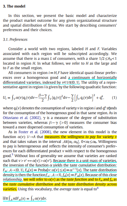 All consumers in region i=H,F have identical quasi-linear preferences over a homogenous good and a continuum of horizontally