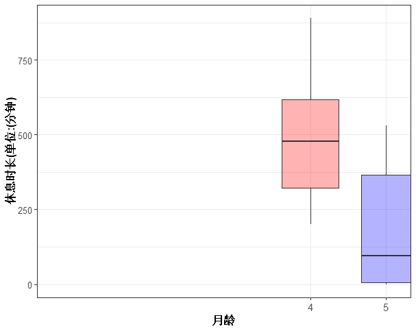 p1<-ggplot(data)+geom_boxplot(aes(x = month, y = 休息,fill=as.factor(month)),alpha=0.3,outlier.colour="red", outlier.shape=18, outlier.size=6,varwidth = TRUE) + scale_y_continuous(name = "休息时长(单位:(分钟)")+ scale_x_discrete(limits=4:5,name = "月龄") +scale_fill_manual(values=c("red", "blue")) +theme_bw() + theme(plot.title = element_text(size = 14, face = "bold"),text = element_text(size = 12), axis.title = element_text(face="bold"),axis.text.x=element_text(size = 11))+theme(plot.title = element_text(hjust = 0.5))+labs(fill="月龄")+theme(legend.position="none")这是代码