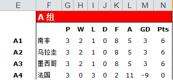 其中南非由于在积分相同的三支球队的互相战绩中拥有较多的净胜球而获首位。