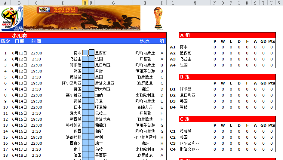 距世界杯开幕还有30天了,送上全套赛程计分表,函数公式完成,可以自动产生出线队伍,生成第二阶段直至决赛的对阵双方。