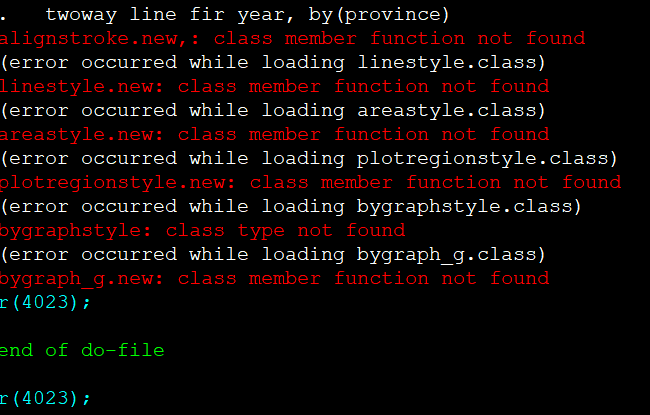 下载了本论坛的stata15的永久序列版本,在执行命令twoway line fir year,by(province)的时候显示下图。后面在帮助里面查找了twoway命令,用软件自己的示例也画不出来,findit twoway 和 ssc install twoway也没有什么反应。