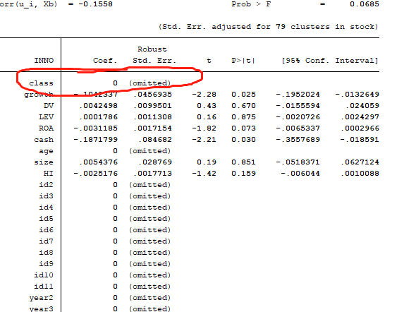 我的自变量是class,双重股权为1,其他为0,因变量是创新投入。本来是用xtgls进行了回归,结果较好。但当我采用如下命令时“xtreg INNO class growth DV LEV ROA cash age size HI id2-id11 year2-year11,fe vce(cluster stock)”,出现如下对应结果: