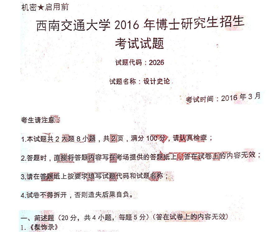 西南交通大学设计史论2016年考博真题博士研究生入学考试试题.pdf