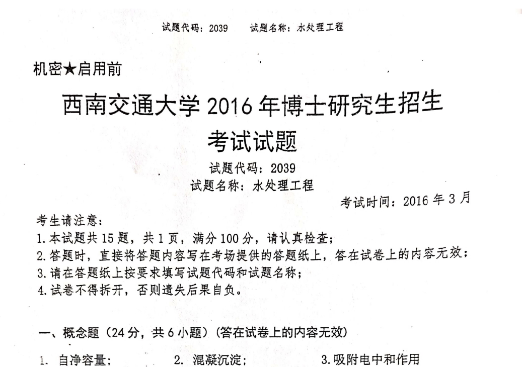西南交通大学水处理工程2015年考博真题博士研究生入学考试试题.pdf