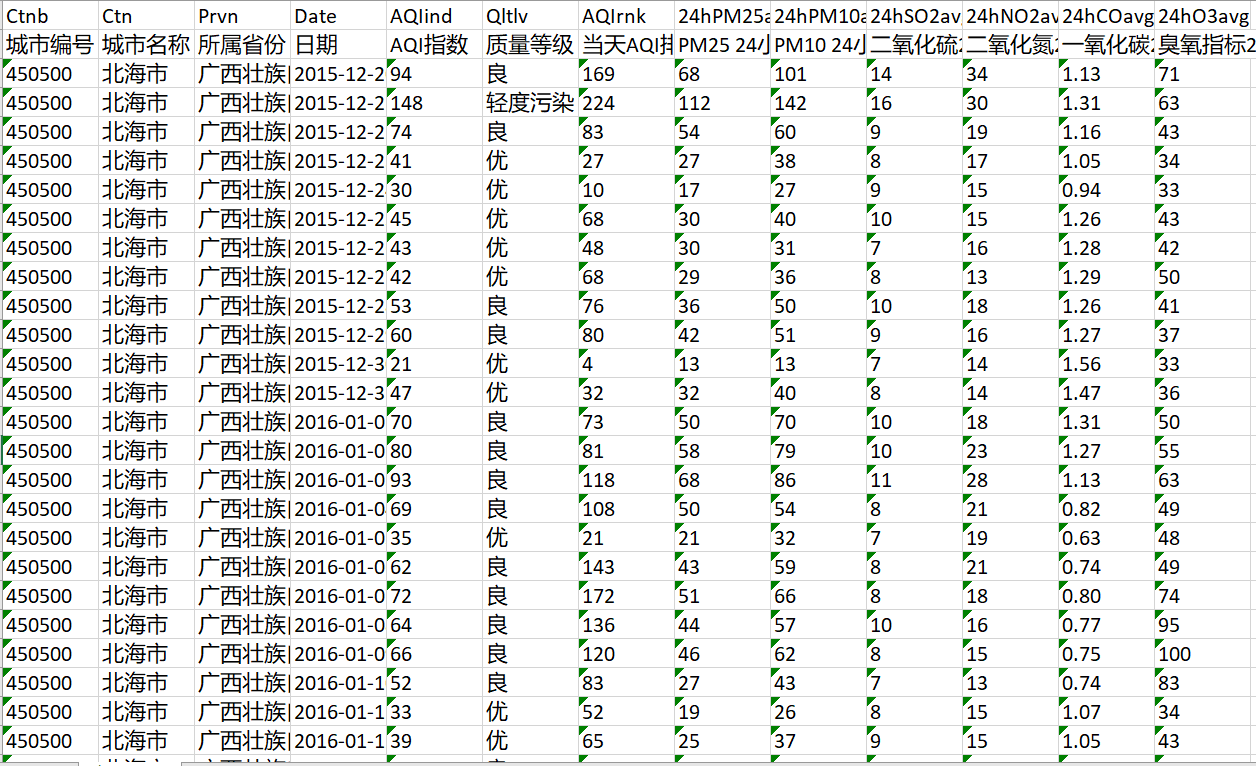 包含指标:城市编号 城市名称 所属省份 日期 AQI指数 质量等级 当天AQI排名 PM25 24小时均值 PM10 24小时均值 二氧化硫24小时均值 二氧化氮24小时均值 一氧化碳24小时均值 臭氧指标24小时均值