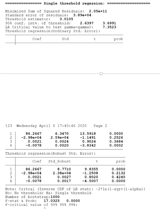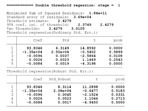 做的是面板门槛回归,已经求得结果。不知道几个数字代表什么变量? 需要找到门槛变量的系数及其他变量的系数,结果里面不同门槛回归有不同的(1,2,3..)根本分不清是啥意思 o(╥﹏╥)o