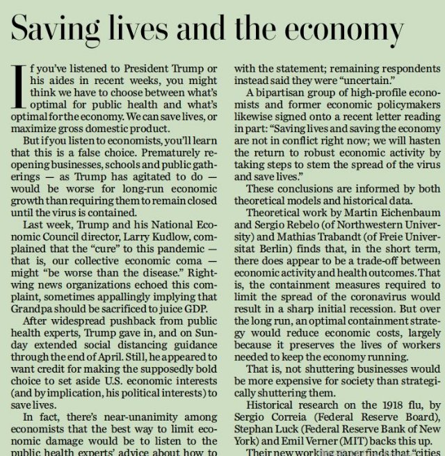 如果你已经听过特朗普总统或其助手最近几周的发言,你也许会想,我们不得不在 什么对公众是最佳的,以及什么对经济是最佳的 之间做出选择。我们可以拯救生命,或者我们可以使GDP最大化。
