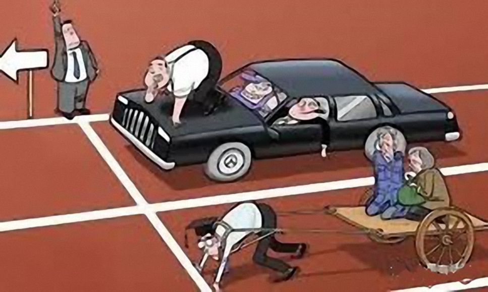 网上也有关于马太效应比较形象的漫画,漫画中两个人虽然站在同一起跑线,但是一个人是站在汽车上,另一个人用平板车拉着两个老人,明显的站在汽车上的人能赢得比赛的胜利,他的积累优势是已有的汽车,这使得他在比赛中更容易获胜(如图10所示)。
