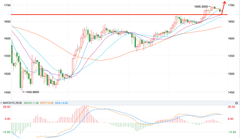 黄金:以1675为多空分界点,继续以做多为主,1680的下方任意点位都可入场。