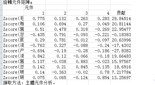 财务指标对总体方差的贡献为负,旋转成分矩阵其中有指标的载荷值都为负。删掉的话所属的主成分都快没了