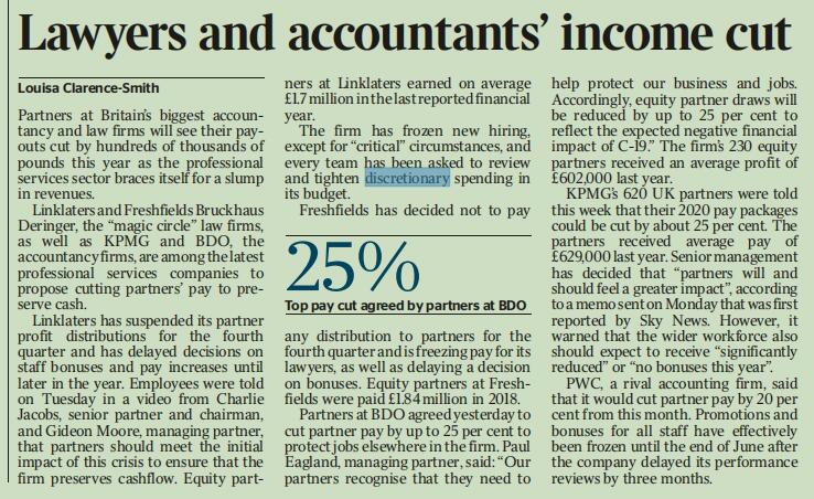 专业性服务机构面临收入下跌,今年英国最大会计师事务所和法律公司的合伙人们的收入将下降数十万英镑。Linklaters和FBD,这个“魔法圈”法律公司,同毕马威、BDO等会计事务所一样,都在 削减合伙人工资以预留资金 的最新专业服务公司之列。Linklaters已经将合伙人利润分发推迟至第四季度,并且延迟了员工奖金和涨薪的决定一直到今年末。周二在一次录音中,员工收到来自CJ,最高合伙人和主席,和GM,合作伙伴,合伙人需要应对这场危机最初的影响以确保公司保持现金流。在去年的金融情况报告中,Linklaters的股东们平均收入是1.7百万英镑。该公司已经停止了新员工招聘,除非是至关重要的情形,并且公司团队已经被要求审核并且严格酌情处理财政方面的花销。Freshfields 已经决定在第四季度不会向合伙人发放任何分成,并且停止向他们的律师发放工资,正如推迟发放奖金的决定一样。Frshfields的股东在2018年获得1.84百万英镑。