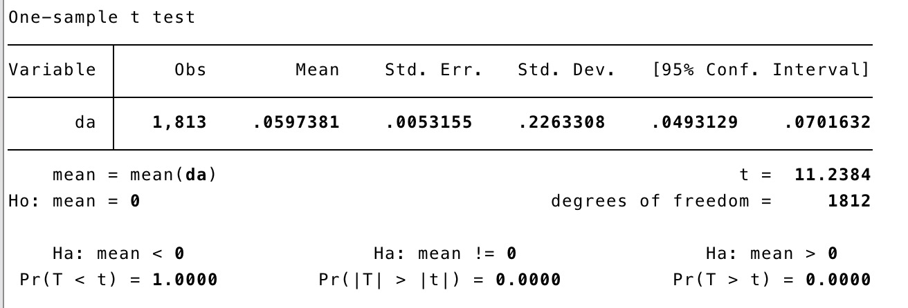 8451942201 发表于 2020-4-14 00:35 做完stata的t检验得到以下结果 论文里的图表应该是输出成什么样子呢 da和0比较的显著性,又该怎么表达在文 ...