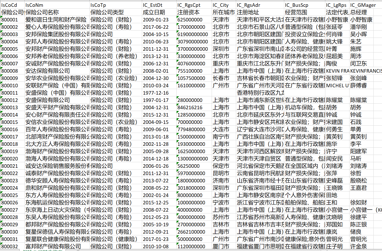 保险公司代码、保险公司名称、保险公司类型、成立日期、注册资本、所在城市、注册地址、经营范围、法定代表人、总经理