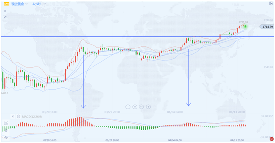 昨天,我相信不少在1700美元/盎司的附近干空的,认为涨了这么多了,不可能上去,4小时也早出现了MACD背离,上涨乏力,动力衰退,找一堆支撑自己看空的理由,期待着市场能来一个"心里想",这种过滤性的判断本身就是错误的,自己看空然后找一堆空的理由和分析来支撑,就像4小时上周背离一样,关键点1642当时没有破位,就意味着这个背离成了诱空,要身就不存在。
