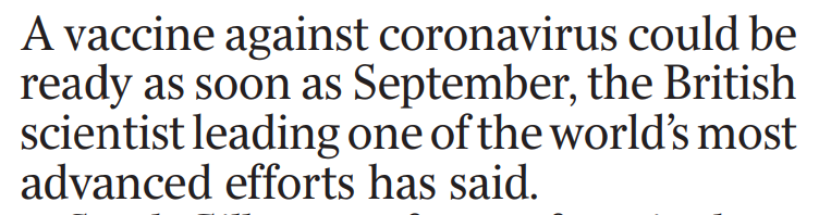 主持世界上最先进的机构之一的英国科学家说,一种针对冠状病毒的疫苗最快可能在9月研制出来