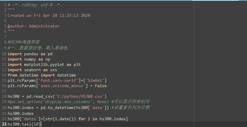 这里展示尾部10行数据,p_close表示前收盘价,中间还有open开盘价,high最高价,low最低价,由于全部展示python会换行排列比较乱,这里展示部分列,大家可以把第19行代码的注释去掉,会显示所有列)