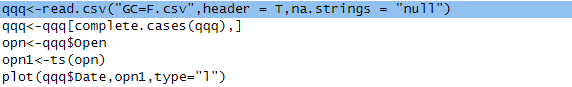 qqq<-read.csv("GC=F.csv",header = T,na.strings = "null")##将导入的null设置为NA