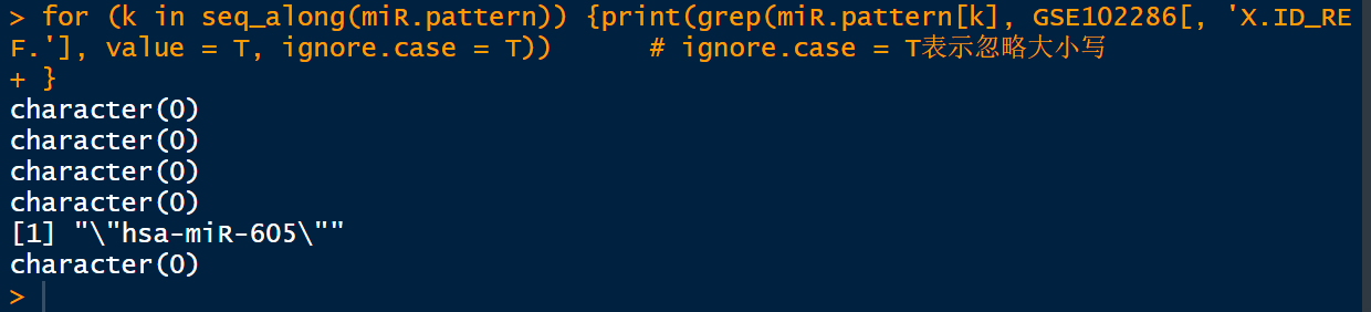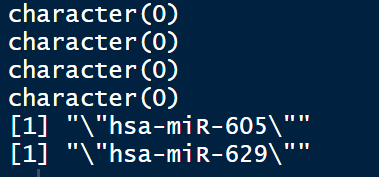 [1] "\"hsa-miR-605\"" 581 (代表在数据集中的行数)