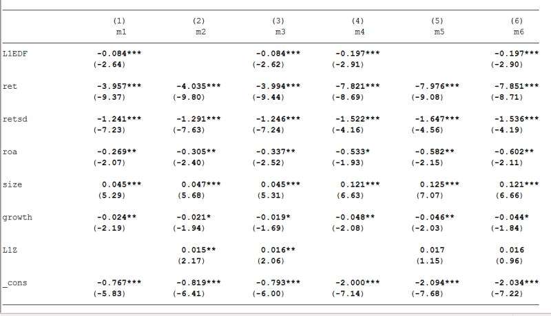我回归得出EDF债务违约概率这个变量对股市崩盘风险ncskew 和 duvol的影响为负显著。。<br>