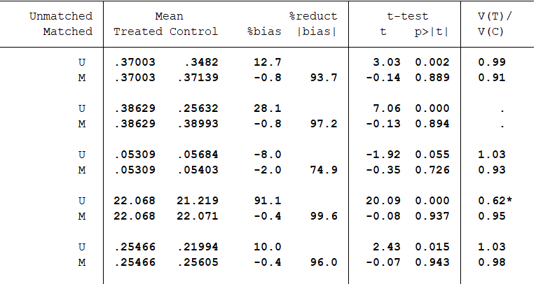 请问大家,为什么用“pstest”指令得到结果是匹配后样本组间差异不显著(下图)但是直接对匹配后的样本使用“ttable2”指令,得到的却是匹配前(unmatched组)的组间均值差异呢?