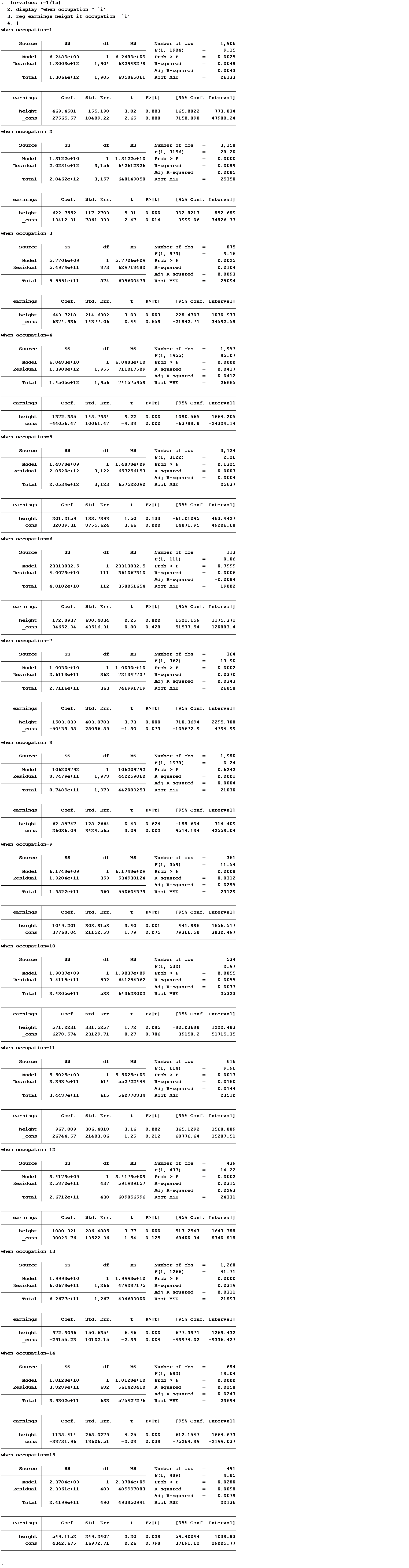 分情况回归分析,讨论不同职业下身高对收入的影响。