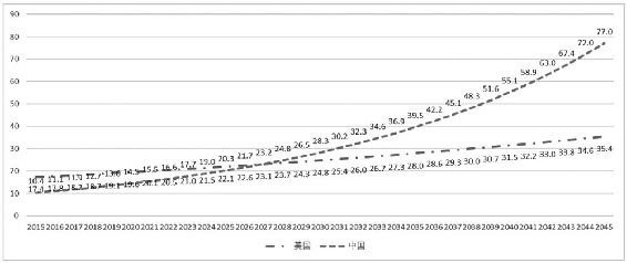 增速是指在一定时间范围内数量变化的比率。两家公司、两个产品、两个市场、两个客户、两个渠道,都可以对比增速。而对比的时间周期可以按照月份、季度或者年度来设定。2015年,美国的国内生产总值为17.4万亿美元,中国的国内生产总值为10.4万亿美元,美国全年经济的增速是2.4%,中国全年经济的增速是6.9%。这就是速度的比较,如下图所示。我们很自然地会问,如果按照这个增速发展下去,中国国内生产总值赶超美国大概要等到哪一年?2027年!