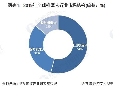 2019年,全球机器人市场规模达294.1亿美元,其中,工业机器人159.2亿美元,占机器人市场份额的54%;服务机器人94.6亿美元,占机器人市场份额的32%;特种机器人40.3亿美元,占机器人市场份额的14%。