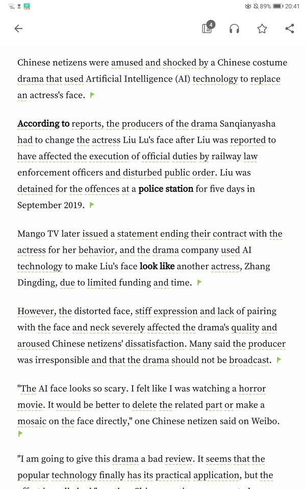 中国市民对于 一部运用人工智能技术来生成一个女演员的脸 的中国戏剧感到好笑又震惊。根据报道,在刘露被报道她影响了道路执法,干扰了公共秩序后,三千鸦杀的制作人不得不改变演员刘露的脸。刘露在2019年九月份的时候在派出所因为这个违法行为,被拘留五天。芒果电视台之后也发表了因为该女演员的行为要终止与她合同的声明。由于资金和时间的限制,该剧的公司使用的人工智能技术使得流刘露的脸看起来像另一位女演员张丁丁。但是这个扭曲的脸僵硬的表情,以及与整张脸和脖子不自然不匹配,严重的影响了整个戏剧的质量,并且引起了中国网友的不满意。许多网友表示制作人不负责任,并且该剧不应该被播放。一位中国网友在微博表示:“人工智能做出来的脸看起来太吓人了,我感觉我看在恐怖片,我觉得将那一部分删去,或者用马赛克直接代替会更好。”另一位中国网友在微博评论道:“我要给这个剧差评,这似乎看起来流行的技术最后都能灵活运用,但是它的效应却是坏的。”