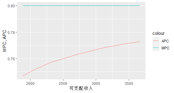 R语言通过收入和消费的一个表格,以可支配收入为x轴,画出APC和MPC
