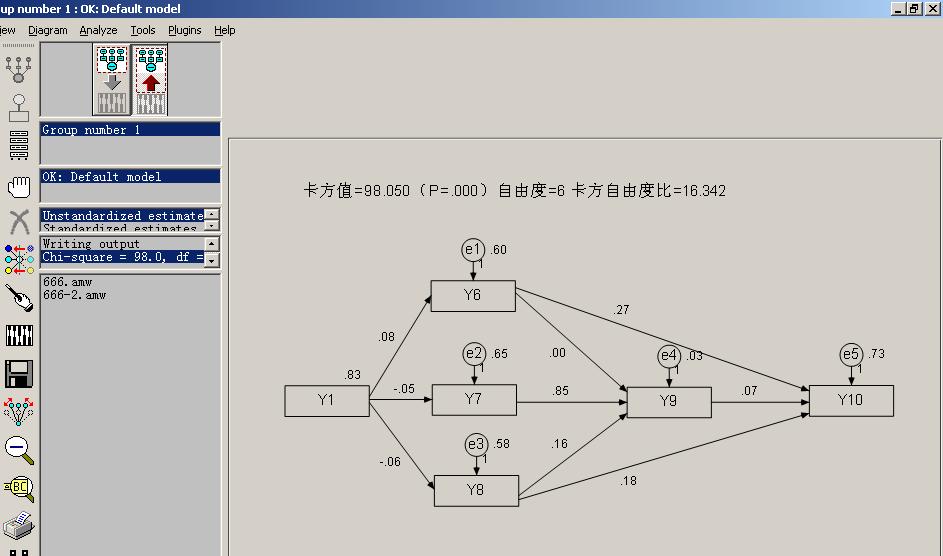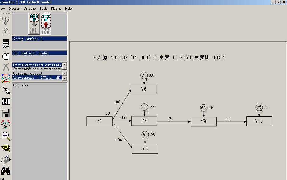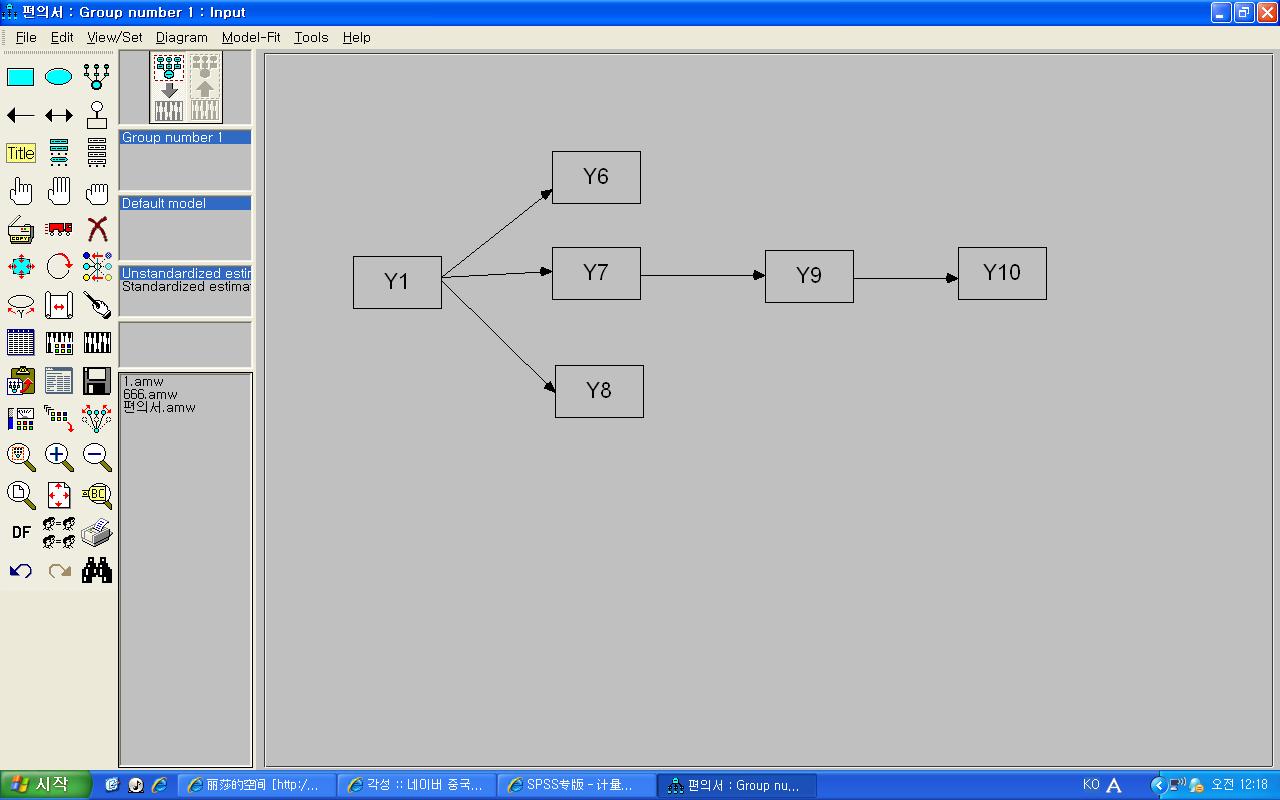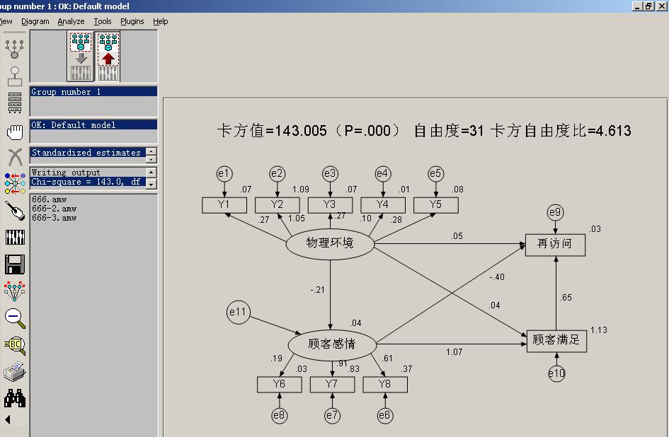 我是做电影院物理环境与顾客的感情,顾客满足,再访问的研究,在附件中各个变量中的Y1~Y5表示的是环境中的便利性,情节性,魅力性,娱乐性与快乐的感觉;Y6~Y8表示的是顾客感情的快利,苏醒,支配感;Y9表示顾客满足;Y10表示在访问。我的假设是物理环境影响顾客感情,顾客感情影响顾客满足,顾客满足影响在访问。而且因为找不到高级版的amos,我用的是amos5.0,里面最多只可以分析8个变量,所以我把模型分开进行分析。首先分析的环境中的便利性对顾客感情,满足,再访问的路径,可是带进去数据分析时出现了下面的错误。