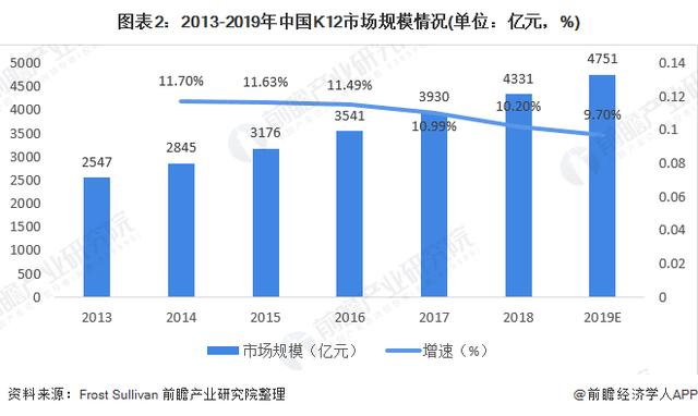 2013-2018年期间我国K12市场规模总体呈逐年增长态势,年均复合增速为11.20%。2018年我国K12市场规模为4331亿元,同比增长14.20%,初步估计2019年市场规模近4751亿元。