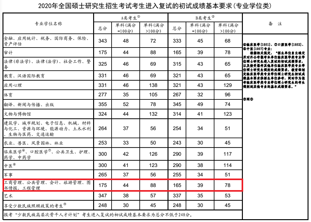 伴随着教育部公布了全国硕士研究生专业学位分数线,其中工商管理硕士MBA的A线和B线分别是175和165。许多报考MBA的学员之前悬着的心总算放下了,今年的分数对于报考的考生来说还是比较“友好”的。详见下图: