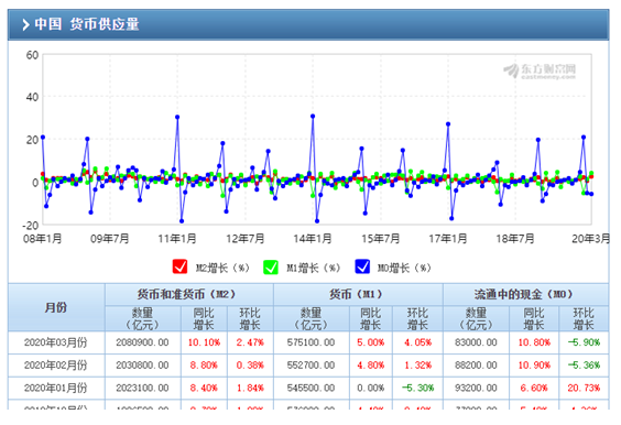 我国近期货币供应量(数据来源:东方财富;数据截止:2020M3)