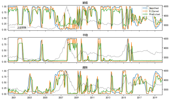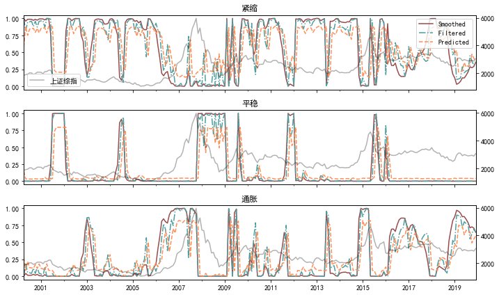 根据下图可以看出当市场紧缩和平稳状态的概率较大时,股市走势平稳甚至有下跌趋势,当通胀的概率较大时,股市明显上涨。