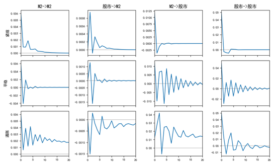 根据BIC准则选择滞后阶数,对于货币政策对股市和货币政策对实体经济的非对称影响,本文均择了滞后阶为3的模型。囿于篇幅限制,仅展示部分实证结果。