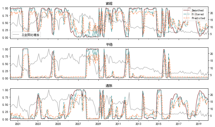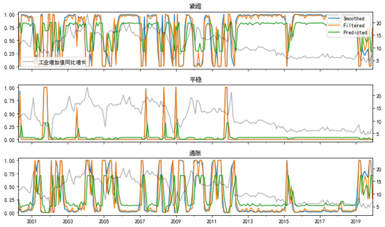 由下图各区制的概率图可以看出处于紧缩和通胀的概率波动频繁,这可能得益于逆周期调节和结构性信贷工具,当市场处于通胀的概率较高时,工业增加值同比增长有攀升趋势。