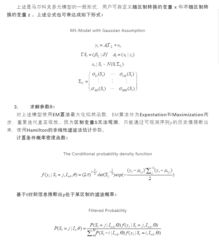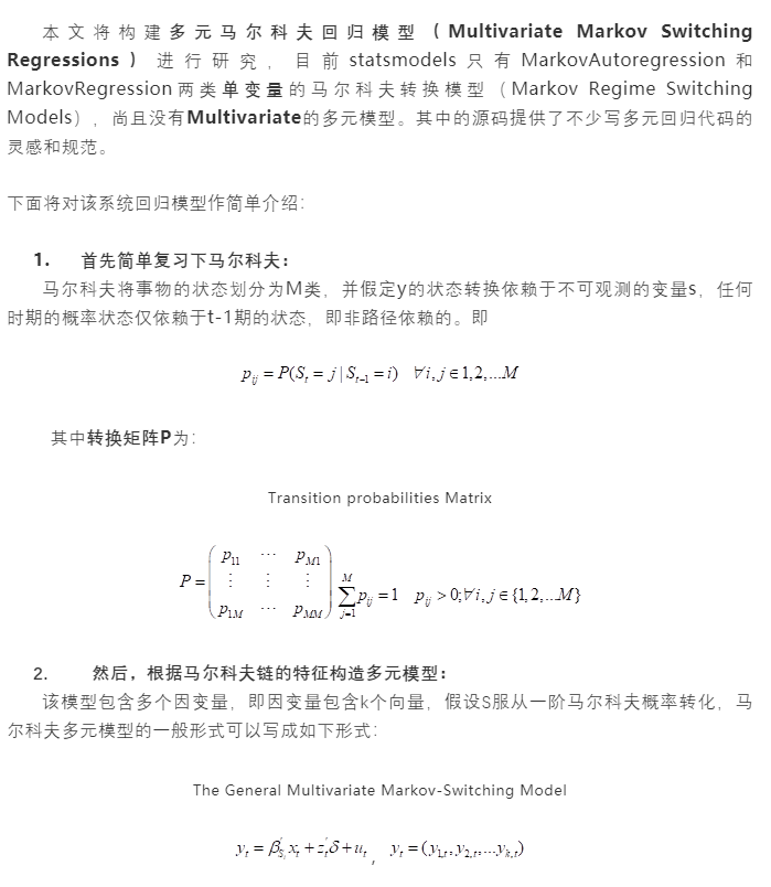 本文将构建多元马尔科夫回归模型(Multivariate Markov Switching Regressions)进行研究,目前statsmodels只有MarkovAutoregression和MarkovRegression两类单变量的马尔科夫转换模型(Markov Regime Switching Models),尚且没有Multivariate的多元模型。其中的源码提供了不少写多元回归代码的灵感和规范。