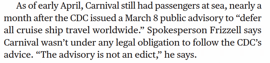 嘉年华公司并没有任何法律义务去听从CDC的建议。他说:“这项建议并不是一项法令。”