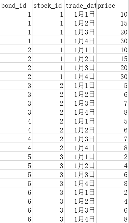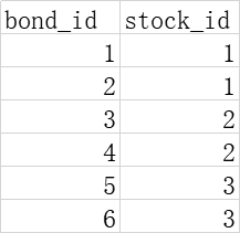 第一个数据集如图一所示,是债券的bond_id和对应上市公司股票的stk_id,一家上市公司可以发行多次债券因此是stk_id一对多bond_id