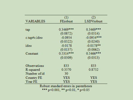 1.xtreg lnopen tap c.tap#c.ideo ideo c.k_ad#c.ideo k_ad i.year,fe r