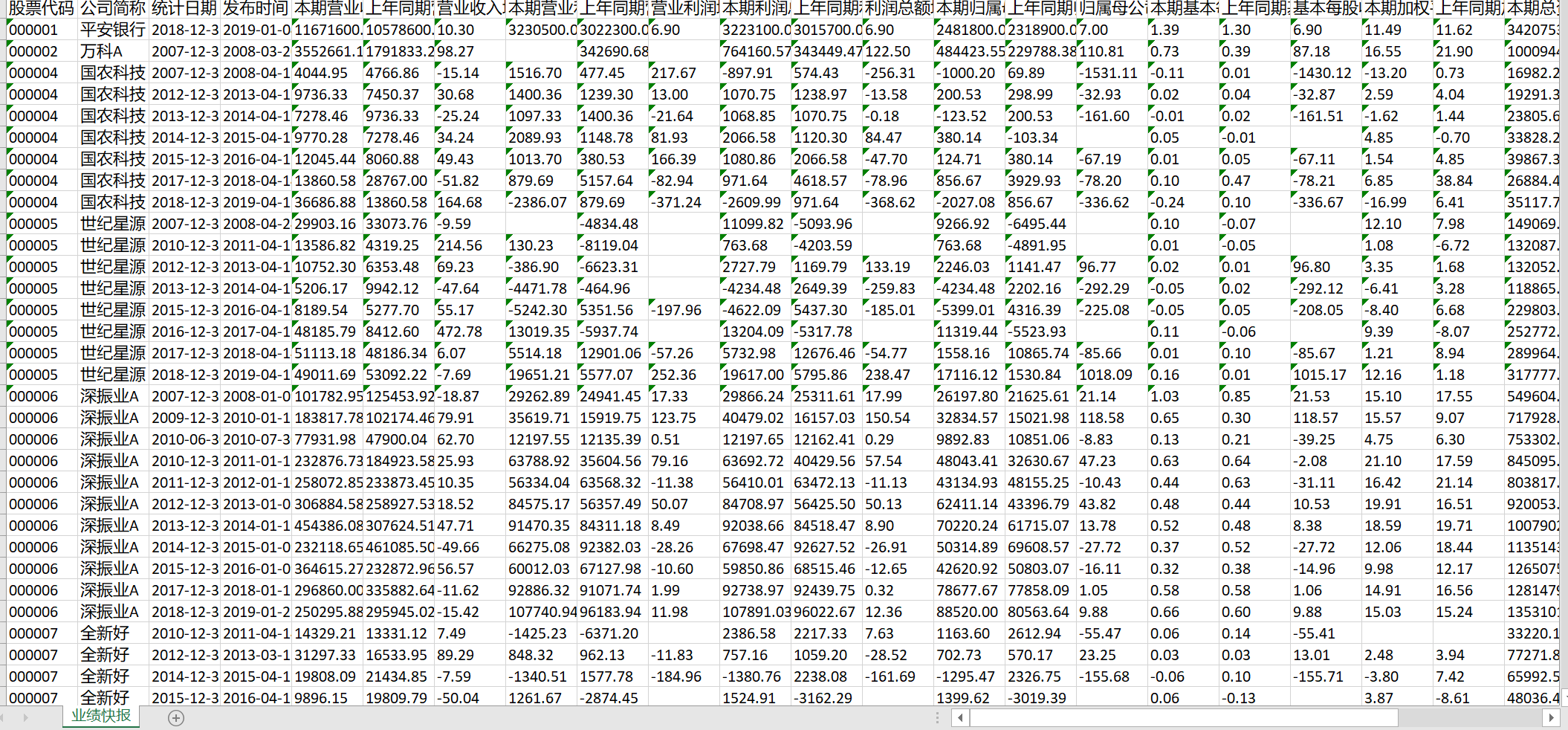 股票代码、公司简称、统计日期、发布时间、本期营业收入、上年同期营业收入、营业收入增长率(%)、本期营业利润、上年同期营业利润、营业利润增长率(%)、本期利润总额、上年同期利润总额、利润总额增长率(%)、本期归属母公司股东的净利润、上年同期归属母公司股东的净利润、归属母公司股东的净利润增长率(%)、本期基本每股收益、上年同期基本每股收益、基本每股收益增长率(%)、本期加权平均净资产收益率(%)、上年同期加权平均净资产收益率(%)、本期总资产、上年同期总资产、总资产增长率(%)、本期净资产、上年同期净资产、净资产增长率(%)、业绩简要说明
