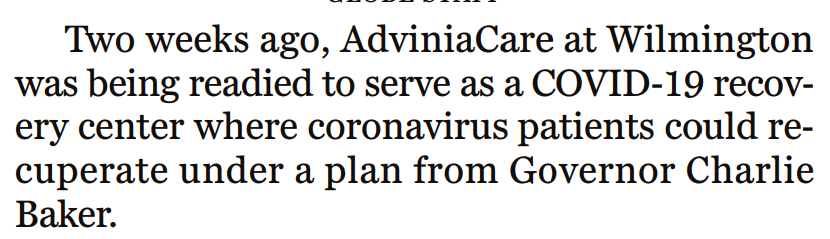 两周前,根据州长查理·贝克的计划,威尔明顿的AdviniaCare正准备作为一个covid19康复中心,冠状病毒患者可以在这里康复。