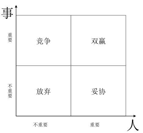 在公司里也是同样的道理。在公司里人际关系是很重要的,但是做事也很重要,公司是一个做事的环境,所以在公司里要尽可能采取双赢的策略;如果人不太重要,像与协作方、供应商等都是商业关系,关系不是那么紧密,一般采取竞争策略;但是如果一家公司历史悠久,人员关系稳定,同事关系超过10年以上,则会很容易弱化事情的重要性,强调人与人关系的重要性,把人看得过于重要,最后只能采取妥协的策略,如下图所示。所以,越是历史悠久的企业,变革管理越难。