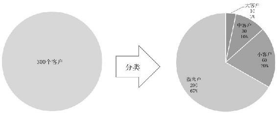 分类是由“分”和“类”组成的,其本质就是把事物分开,归到不同的类别中并分别识别,从而获得对事物的重新认知。如果我们把客户分成不同的类别,就可以更仔细地识别客户。如果将客户按照大小来分类,就有了大客户、中客户和小客户,这样我们对“客户”这个研究对象就有了更加深刻的认知,对所拥有的客户结构也有了更加深入的了解。例如我们总共有300个客户,如果将其分成10个大客户、30个中客户、60个小客户、200个微客户,那么客户从一个整体变成了由4种客户组成的结构化组合,如下图所示。