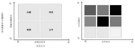 下面再介绍一个矩阵——GE矩阵。在做产品或者业务分析时,可以通过产品的未来发展潜力(或行业吸引力)和现在的市场占有率这两个维度对产品进行描述。麦肯锡在给GE做咨询的时候发现波士顿矩阵有一定的局限性,因此增加了市场吸引力指标,包括业务未来发展前景如何、竞争水平如何、发展速度如何、客户资源状况如何等,由此形成了GE矩阵。GE矩阵有更多的维度来评价市场吸引力和业务竞争力。GE矩阵在本质上是把业务分为两个维度来描述形成的矩阵,我们称其为矩阵分析法。