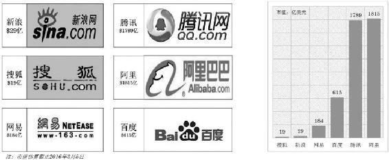 对于现有的互联网公司,可以从业务的角度对其进行分类,例如阿里巴巴是平台型电商公司,京东是物流型电商公司,百度是搜索引擎型公司,腾讯是通信社交型公司,网易是游戏型公司,新浪是媒体型公司……这些是从各个公司主营或者最大的业务模块来分类的。我们也可以从互联网发展的历程来看不同业务的发展潜力,互联网从一个媒体型工具(互联网媒体、新闻、搜索、信息传播),逐步发展成内容传播平台(微博、博客等)再发展成社交平台(微信、脸书、推特等),目前,互联网开始在传统行业中普及应用,并有了新的创新应用领域,发展成了资源整合平台(O2O服务、共享经济、微商等)。这些都是一个技术在发展阶段上的应用创新所带来的时代变化,这些也影响着不同业务的商业价值,越紧跟时代的技术价值越高,所以媒体型的新浪只有30亿美元左右的市值,游戏平台型的网易则有接近200亿美元左右的市值,而电商平台型的阿里巴巴和社交平台型的腾讯则有接近2000亿美元的市值,如下图所示。